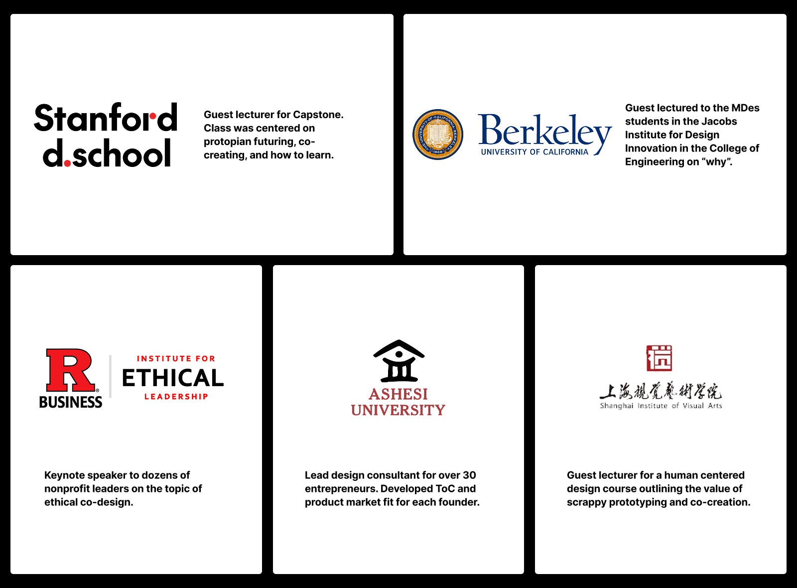 I translated classroom-level experimentation into lectures, workshops, and curricula for graduate students and professionals. Over time, I taught at institutions including Stanford d.school, UC Berkeley, and Rutgers Business School. Each session was treated as a designed experience, balancing clarity, rigor, and invitation while meeting learners where they were.